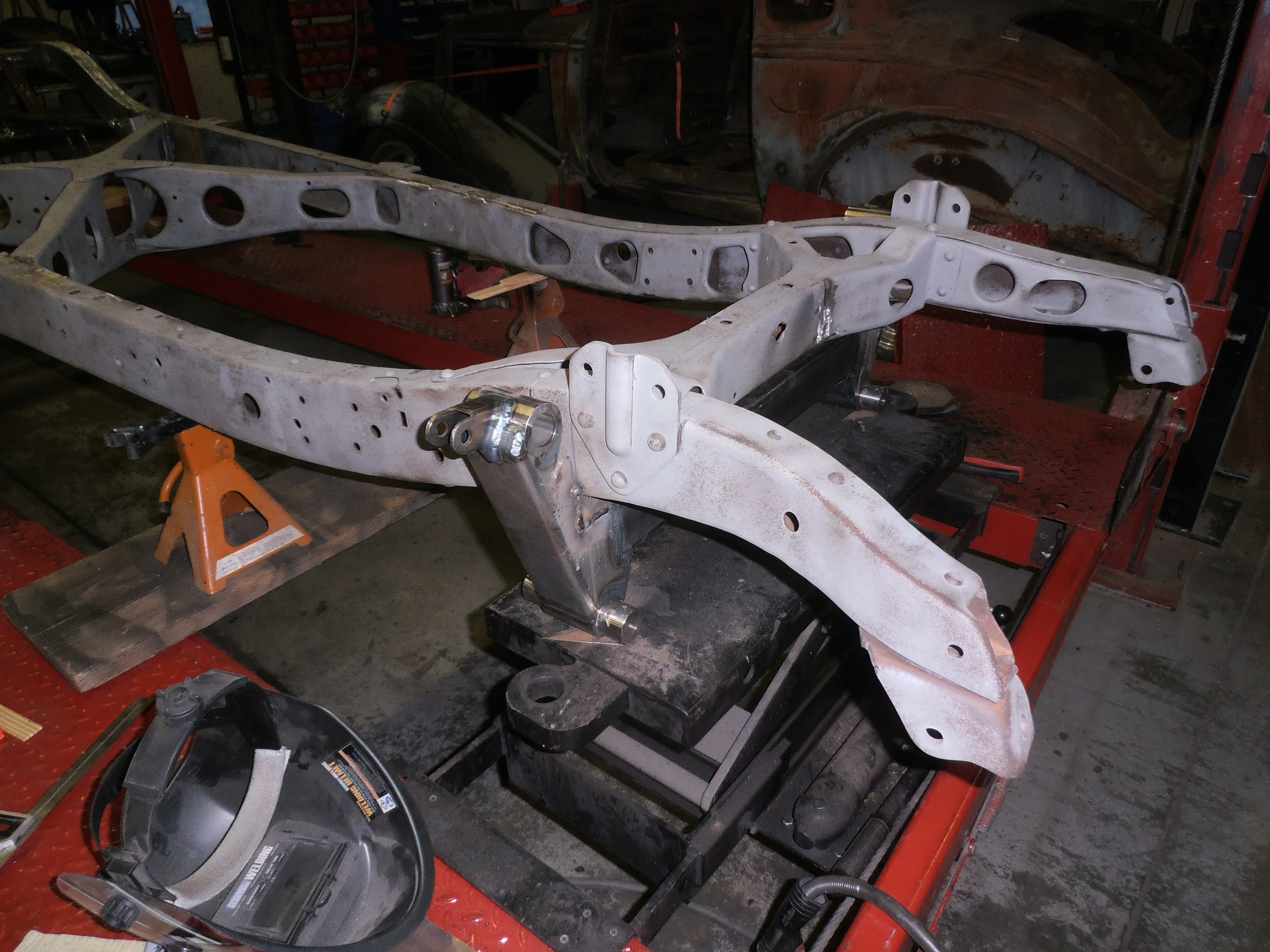 The frame was sandblasted. Then it was checked every which way to be true and straight. All welds were examined. New welding of questionable joints. Then the frame was boxed. Originally almost all frames for vehicles were “C” channels—actually more like this “[“. By boxing is meant the addition of steel on the open side forming a closed rectangular shape. Heavier but much stronger and given the age of the old frame and the new duties to be asked of it, better to have the stronger, more rigid frame. After all the preparation work the frame is carefully painted with a rust inhibiting paint.