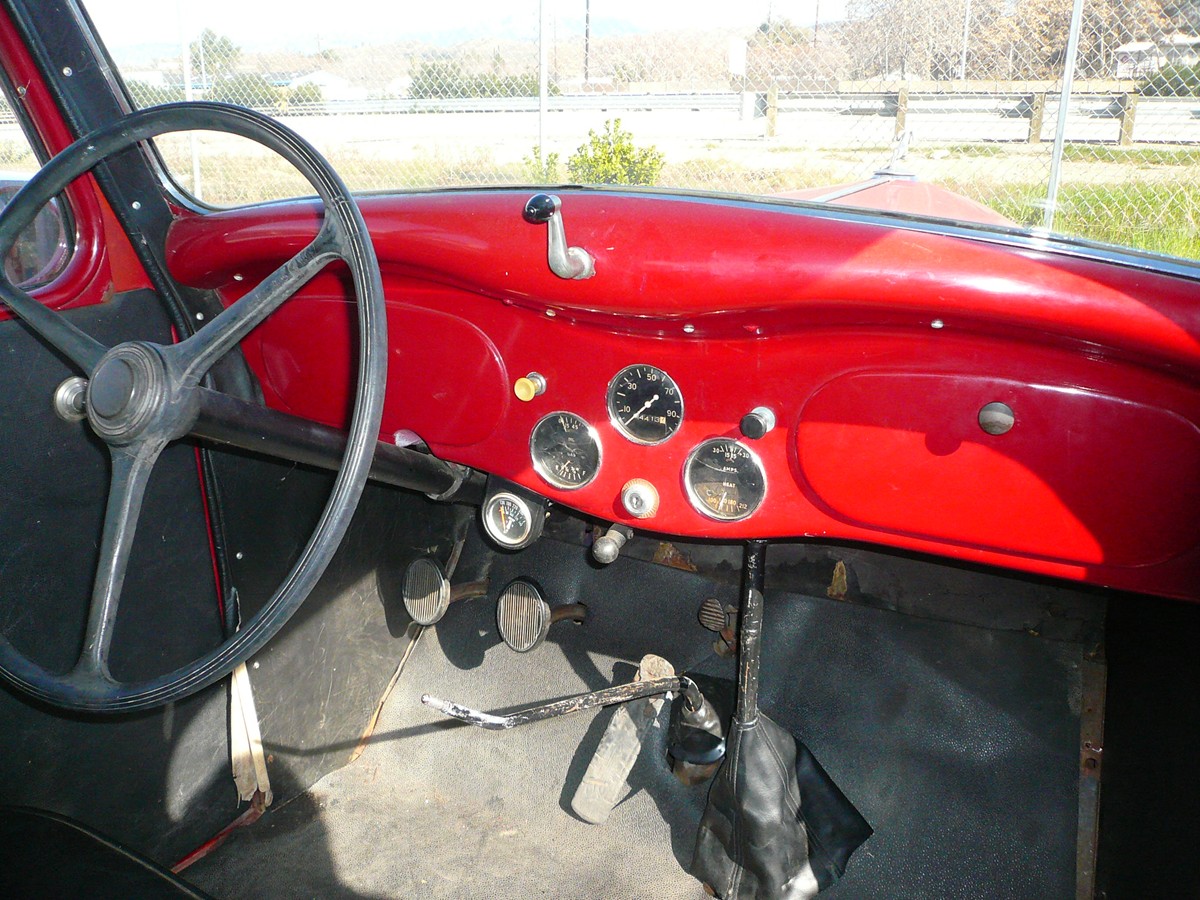 complete. Notice that the steering column runs through the dash, not below it. We are using a “Steer Clear” chain device that allows a more horizontal path for the steering column. The windshield crank is also now visible as is the ignition switch to the far left. The two AC vents are functional and both heat and cool air will enter the cab through the dash. The glovebox is not functional although it was originally. We had to seal it as there is no room behind it for a box of any useful depth.