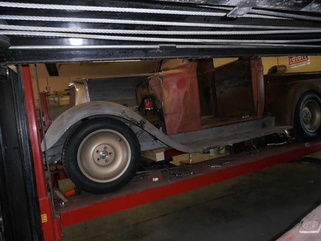 One thing depends on another. Although isn’t a set sequence to rebuilding a car some jobs clearly must precede or follow others. For example, the engine placement is critical but it must be set onto the frame such that the carburetor is level with the ground. But how would you know what is level with the ground if the frame isn’t straight with, the suspension bits in place? Street rods of all sorts typically have “bigs” and “littles”.  The tall tires and wheels are in the rear and the shorter ones up front. Don’t ask me why they just do. Almost always. If those tires aren’t on the vehicle how could you determine level? And there are many other examples.